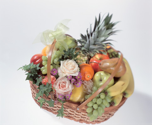 Beautiful display of flowers and fruit gift wrapped together in a unique presentation. Flowers to brighten the atmosphere, and fruit to nourish the body. Thougtfullness at it’s best!