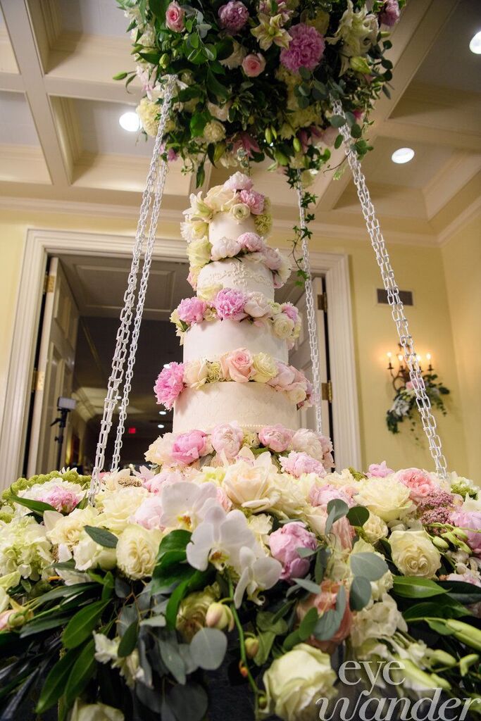 Hanging wedding cake, hanging in air filled with beautiful peonies, garden roses, dendrobium orchids, roses, hydrangea, lilies, phaleonopsis orchids
